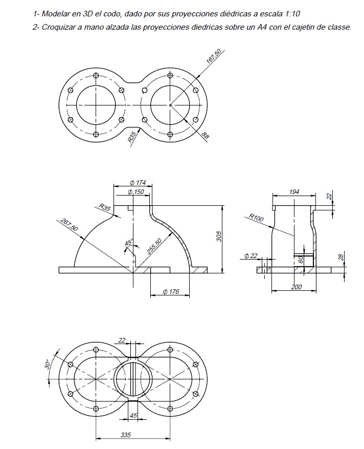 He modelado la siguiente pieza (Codo), dadas sus proyecciones diédricas.