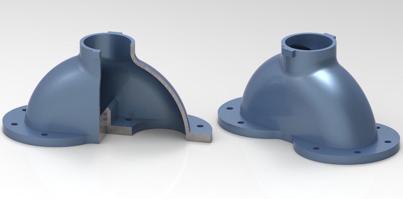 Al margen de la cuestión anterior, ahora queda por ver cómo es el interior, y es que, dependiendo de cómo sea la unión con los dos tubos inferiores, se puede hacer de varias formas, de tal forma que aparezcan o no los escalones que comenta Ricardo. Si en el codo van a entrar los extremos de los tubos, entonces los huecos serán cilíndricos, y aparecerán los escalones; si por el contrario, los extremos de los tubos no entran en el codo, entonces los huecos no tienen por qué ser cilíndricos, y en ese caso es posible hacer los huecos de tal forma que no queden los escalones. Yo me inclino más por ésta última opción, y es que viendo los planos originales, podemos ver que la arista del escalón de la sección del alzado no llega al final. En la siguiente imagen podeis ver la diferencia entre una pieza modelada sin escalón y otra con escalón.