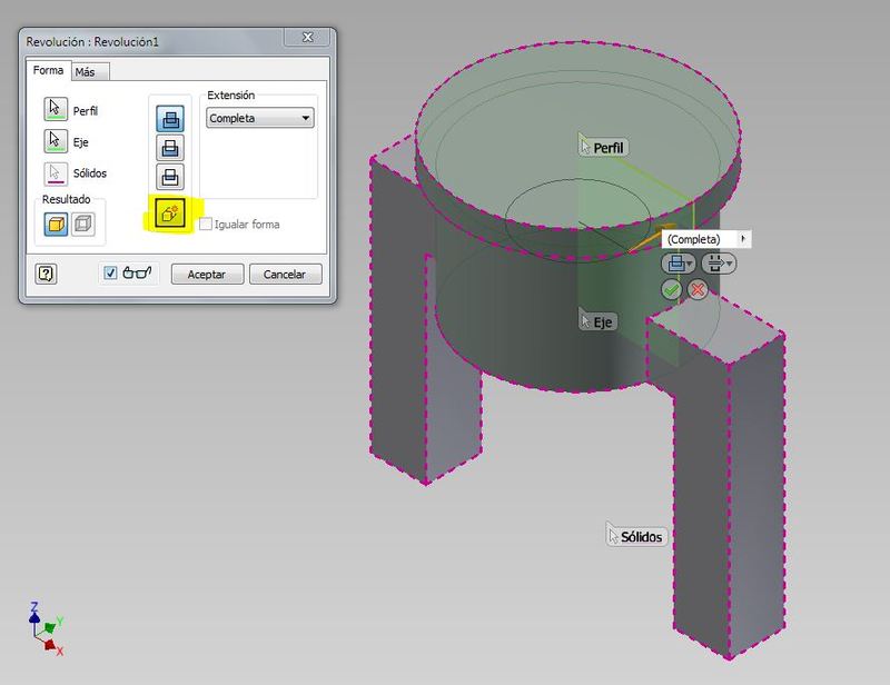 De todas formas, tanto en revolución, como en extrusión y en algunas operaciones mas, tener cuidado con el icono que selecciona Ricardo, no se por que motivo hay veces que se activa el solo y nos hace un sólido nuevo con la operación que estamos haciendo. ¿Para que esta este comando entonces?, pues en ciertas ocasiones nos interese hacer dos operaciones individuales y luego sustraer a una la otra. No esta de mas su existencia.